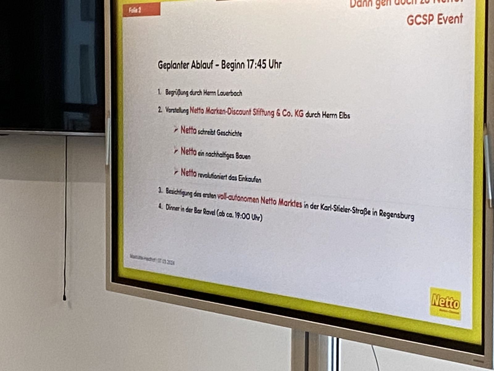 Unser engagierter Aktivposten der Region Süd, Florian Lauerbach, ILG hat mit sehr großem Erfolg seine Rolle als Regionalbotschafter wahrgenommen und am 07.03.24 in Regensburg mit der Besichtigung Europas größter voll-autonomen Ladenfläche in einem Netto Markt mit rund 800 m² den Zeitgeist getroffen. Über 25 Teilnehmerinnen und Teilnehmer waren vor Ort, um von Ingo Elbs, Geschäftsführer, Netto Marken-Discount im persönlichen Gespräch zu erfahren, wie das neue Konzept von den Kunden angenommen wird und wo die Herausforderungen liegen. Über Perspektiven, Risiken und Chancen haben alle Gäste dann beim anschließenden Dinner ausführlich diskutiert. Ein besonderer Dank geht dabei an die ILG-Gruppe und Florian Lauerbach für die großzügige Unterstützung des Dinners!