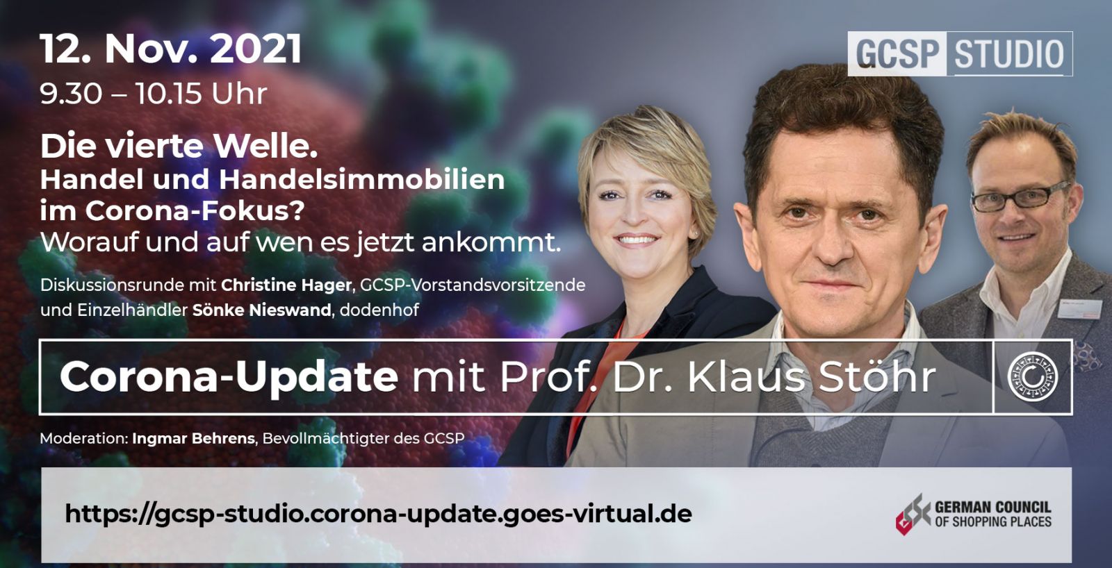 Wir haben daher kurzfristig Prof. Dr. Klaus Stöhr gewinnen können uns morgen ein Briefing und einen Ausblick für den Handel und die Handelsimmobilienbranche zu geben. Der Einzelhändler Sönke Nieswand,Geschäftsführer Dodenhof, diskutiert zusammen mit Christine Hager,Vorstandsvorsitzende GCSP und Prof. Dr. Klaus Stöhr die Situation live aus unserem GCSP Studio. Moderation Ingmar Behrens, Bevollmächtigter des Vorstandes.